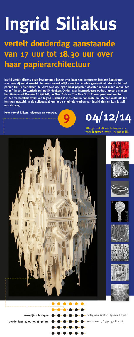 We nodigen je graag aanstaande donderdag 4 december van harte uit voor de bijzondere lezing van Ingrid Syliakus, papierarchitecte. Je zult verrast worden door de complexiteit, diversiteit en het hoge niveau van het werk van Ingrid. Nog meer als je weet dat bijna elk project uit slechts één vel papier gemaakt is...