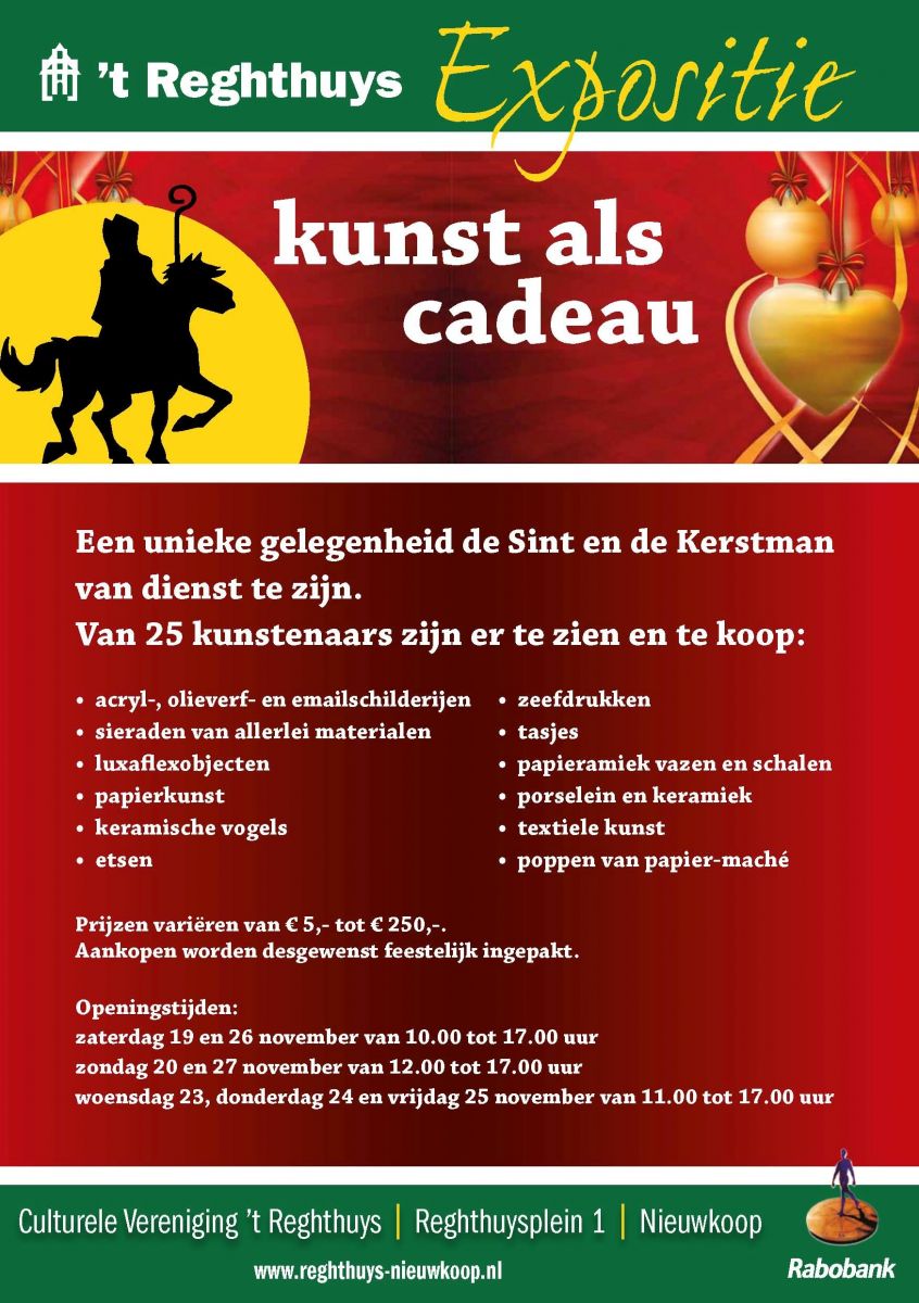 De flyer van 'Kunst als Cadeau' in 't Reghthuys te Nieuwkoop.