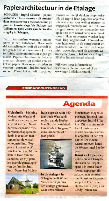 Willem en Toos Visser,Westersingel 3 – 1741 MZ – Schagen Tel. 0224 - 216114 wjj.visser@quicknet.nl www.kunstpleinschagen.nlExpositie van 1 mei t/m 30 juni van Ingrid Siliakus - papierarchitect/kunstenaarMet trots kondig ik deze kunstenares aan,De in Amsterdam wonende kunstenares is een autodidact. Door middel van zelfstudie heeft zij zichzLees meer >> | 1608 keer bekeken