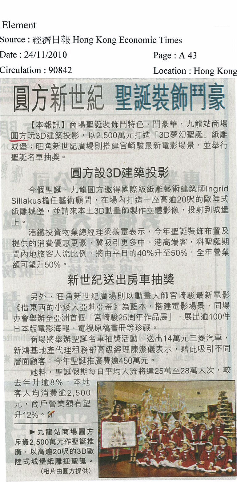 Kerstdecoraties (o.a. een wit kasteel) gemaakt van een ontwerp van Ingrid in shopping Mall 'Elements' te Hong Kong. Zie persbericht op de site van 'Elements': http://www.elementshk.com/eng/elements/detail/000000007.htm